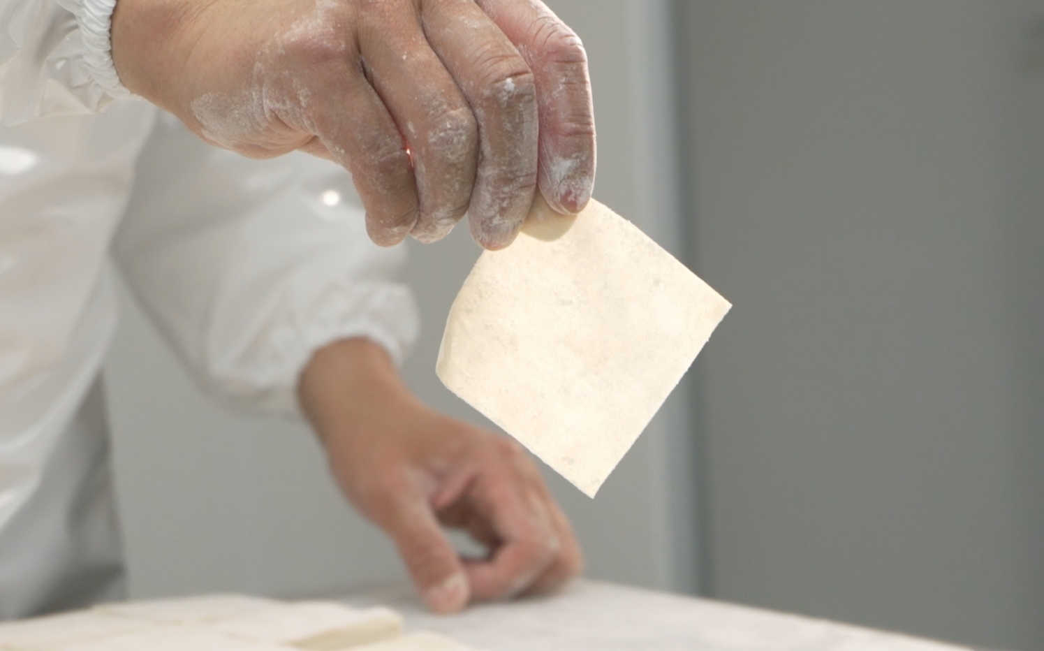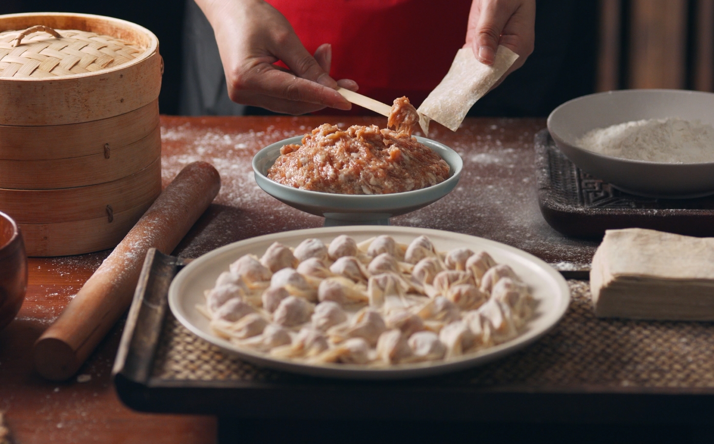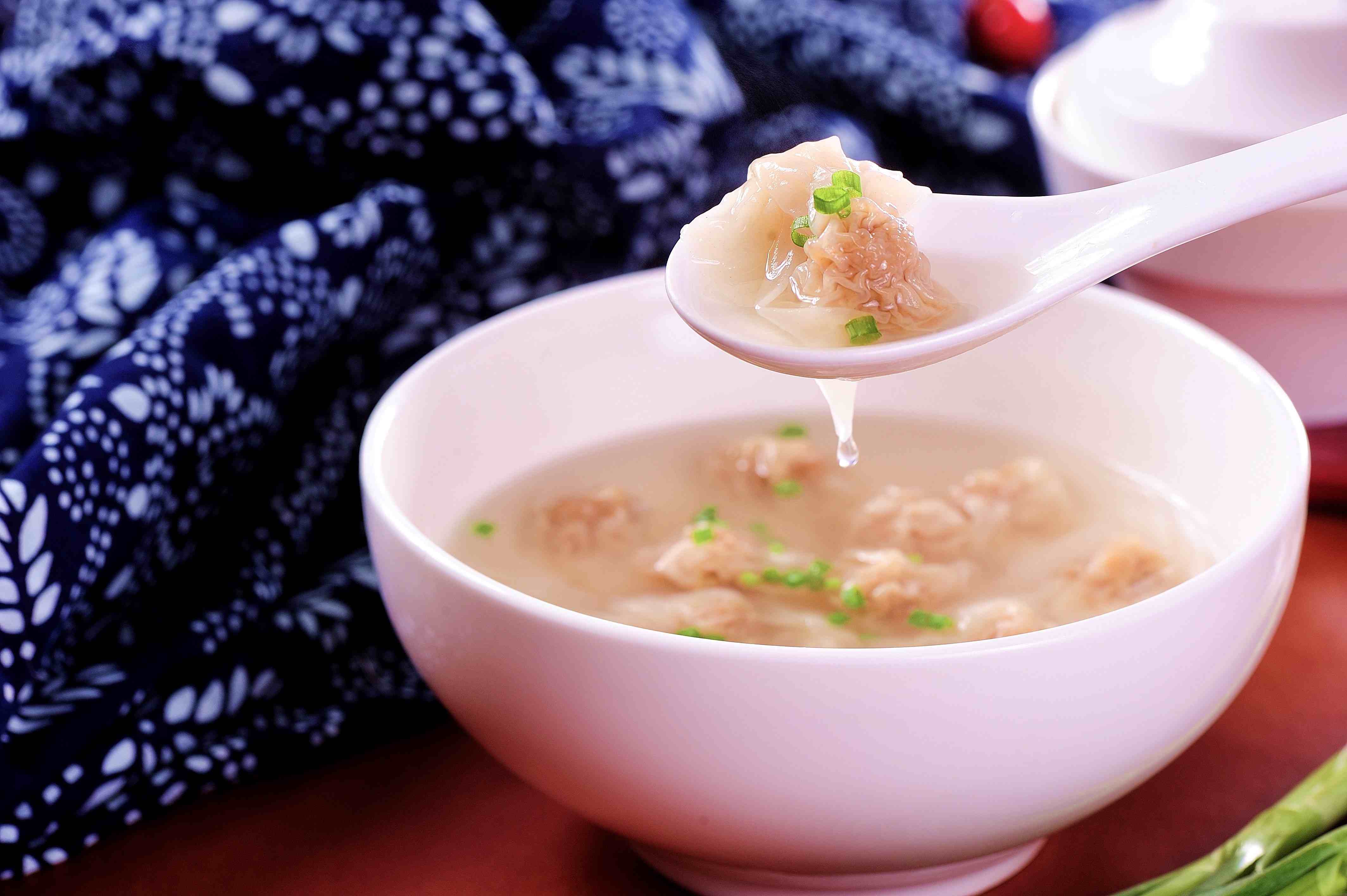 肉馅精选猪前腿的“三肥七瘦”黄金部位,手工剁至颗粒分明,拌入祖传酱汁腌制。直至今日,尚干小吃仍保留着手工包制扁肉的传统技艺,一手持皮,一手持馅,轻轻一捏,状如“金鱼”般的扁肉成型。煮制后,皮近透明,鲜香味美。