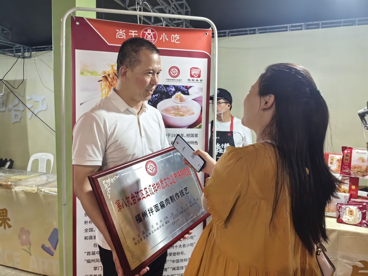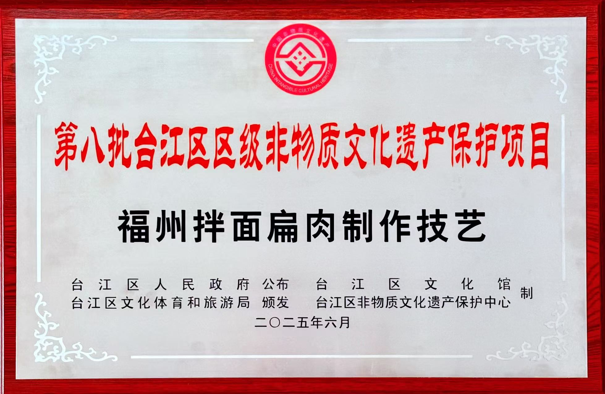 作为本次启动仪式的重头戏,主办方现场公布了新认定的台江区区级非遗项目、区级非遗传承人、新增的非遗保护单位、新增的非遗传承空间。其中,尚干餐饮公司的“福州拌面扁肉制作技艺”正式列入台江区第八批非物质文化遗产项目名录。中华老字号“尚干小吃”第四代掌门人、福州尚干餐饮管理有限公司总经理郑炳春上台接受授牌。