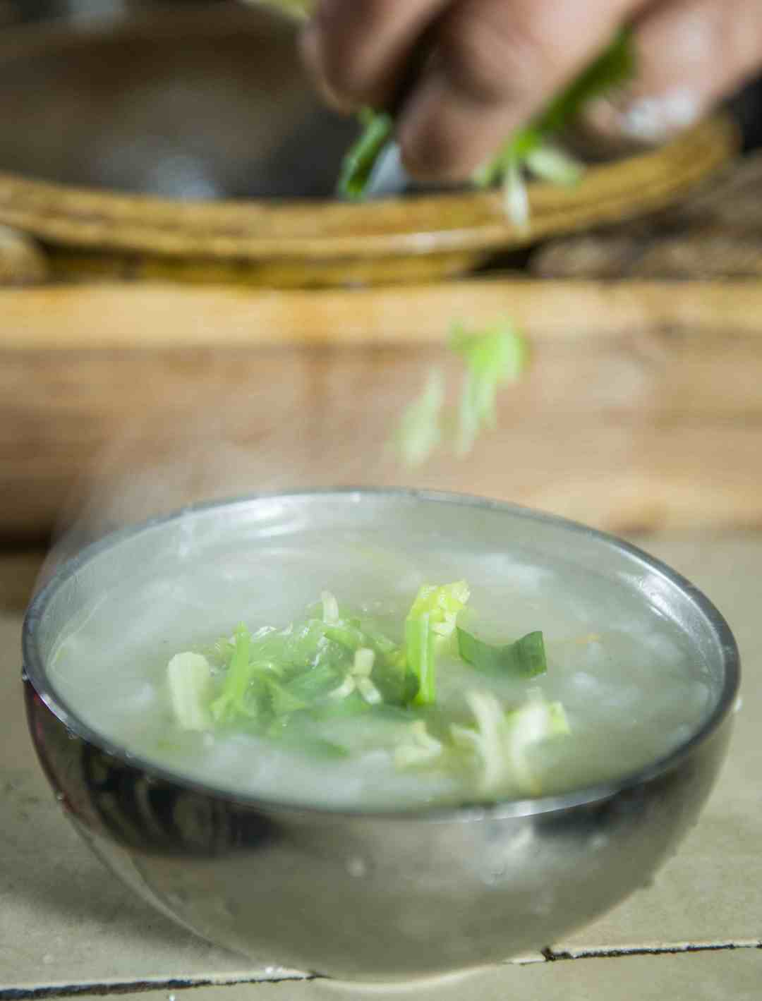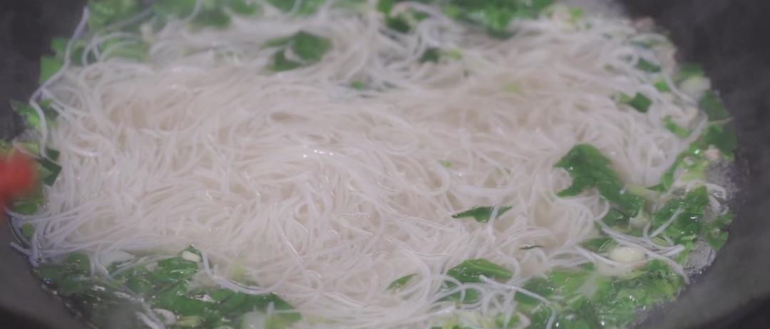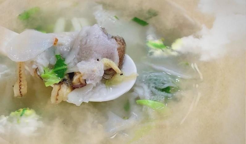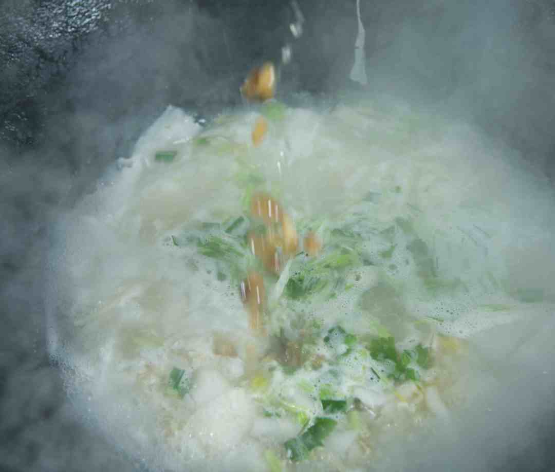 蚬子入锅翻炒后,加水,再添入干贝边、虾皮、香菇等鲜货,煮成鲜香的蚬子汤底,等待锅边成型铲入锅中,煮熟即可出锅,出锅前撒入一把芹菜碎。