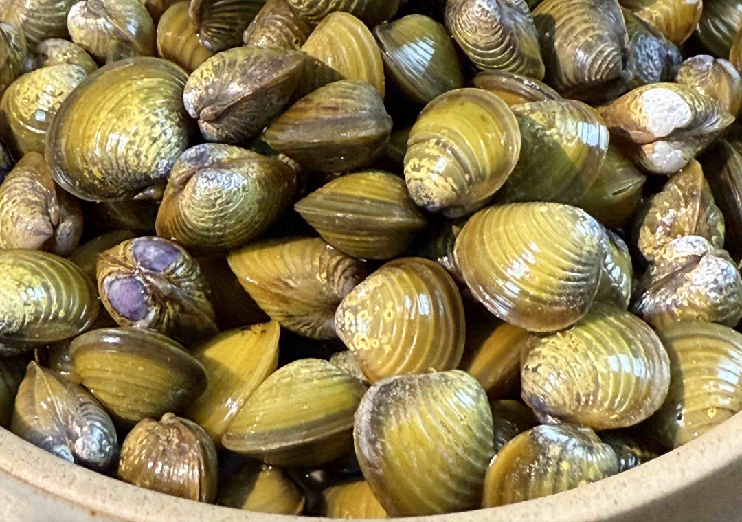 而后,下入汤汁的第二大灵魂:闽江黄蚬子,福州人从小吃到大的河鲜,福州方言唤作 “纽囝”,因其形似纽扣而得名。